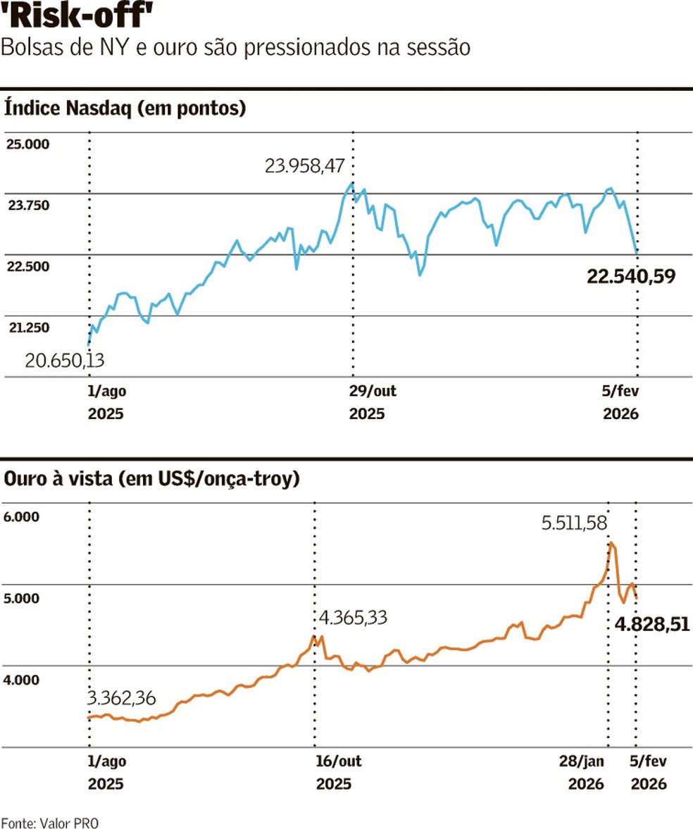 Antes mesmo da abertura dos negócios à vista em Nova York, o mercado já apontava para uma continuidade da liquidação recente em ativos que se beneficiaram do chamado “debasement trade” anti-dólar, como o bitcoin e os metais preciosos. Esse movimento se intensificou ao longo do dia e levou a criptomoeda a ficar abaixo de US$ 70 mil pela primeira vez em dois anos. Entre os metais preciosos, o contrato futuro do ouro com entrega para abril fechou em queda de 1,24%, cotado a US$ 4.889,5 por onça-troy, e a prata com vencimento em fevereiro caiu 9,07%, a US$ 76,52.