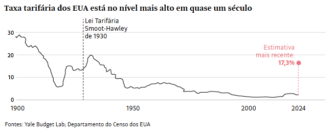 A taxa tarifária efetiva dos EUA de 17,3%, de acordo com a estimativa mais recente de Yale, é a mais alta desde 1935, quando a taxa era de 17,5%. Este número pode aumentar ainda mais se Trump cumprir sua ameaça de impor tarifas recíprocas completas aos países que não conseguirem fechar um acordo com ele até 1º de agosto.