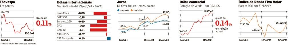 A sessão também foi de dólar mais forte globalmente. O índice DXY – que mede a relação entre o dólar e uma cesta de moedas – subiu 0,46%. Na contramão do movimento observado lá fora, o dólar à vista e os juros futuros encerraram o dia em queda no Brasil. A divisa americana recuou 0,14%, aos R$ 5,6903. Já a taxa do contrato de Depósito Interfinanceiro (DI) com vencimento em janeiro de 2029 teve queda de 12,97% para 12,88%; e a do DI de janeiro de 2031 recuou de 12,93% para 12,86%. O Ibovespa, por sua vez, teve um dia foi de forte oscilação: sem o suporte das ações de blue chips, com destaque para Vale e Petrobras, sob pressão na sessão, o índice encerrou em queda de 0,11%, aos 130.362 pontos.