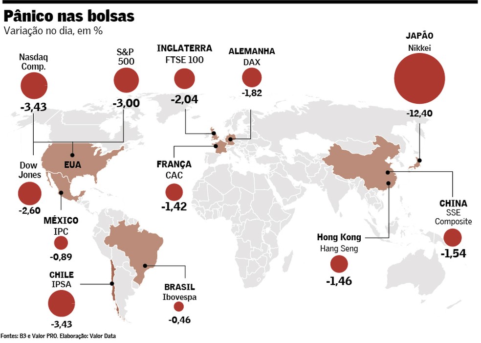 O pregão foi de tensão elevada desde os minutos iniciais. Durante a madrugada, bolsas asiáticas sofreram fortes perdas, com receios de desaceleração econômica dos EUA e temores relacionados à euforia com empresas de tecnologia. O Nikkei, principal índice do mercado japonês, caiu 12,4% – maior queda desde 1987 – e o índice Kospi, da Coreia do Sul, encerrou em baixa de 8,7%.
