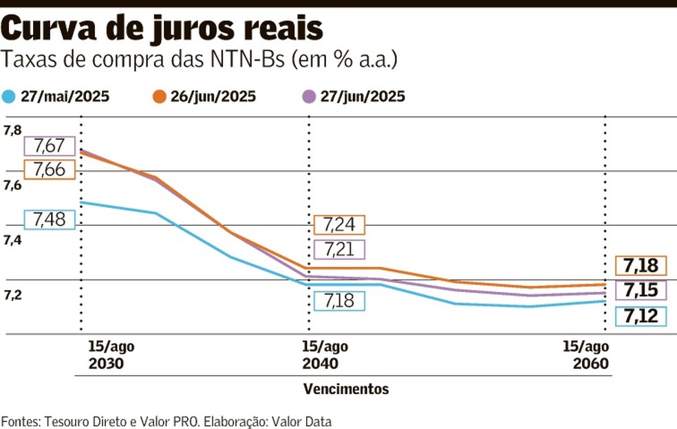 É esperado que, com uma taxa Selic de 15% e indicações do Banco Central (BC) de que a política monetária permanecerá restritiva por um período prolongado, a parcela mais curta da curva de juros real exiba um nível mais elevado. Isso se verifica ao se observar os juros mais curtos — a taxa da NTN-B para 2026 ficou em 9,877% na sexta-feira, de acordo com a Anbima.