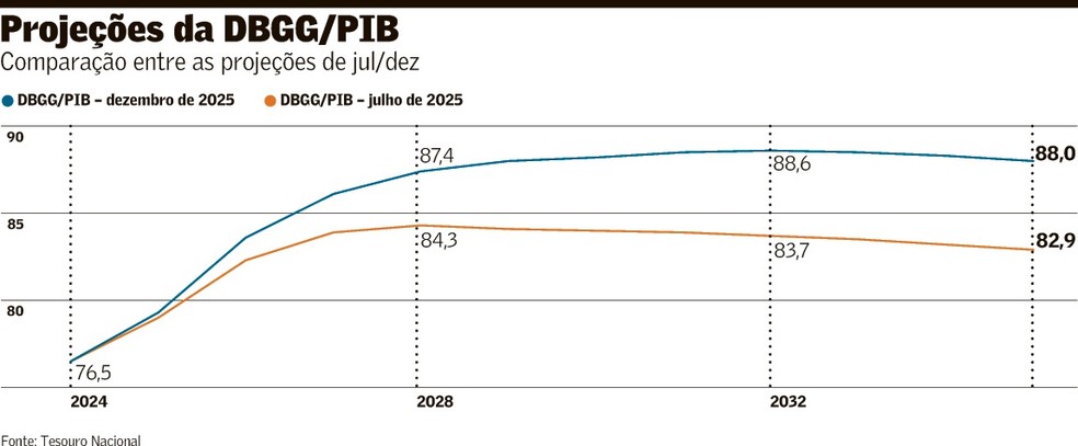 Segundo o Tesouro, a relação DBGG/PIB atingirá 83,6% em 2026, acima dos 82,3% projetados no relatório de julho. Em 2027, a diferença se amplia: a dívida sobe para 86,1% do PIB na projeção de dezembro, ante 83,9% na estimativa anterior. Em 2028, a DBGG chega a 87,4% do PIB, enquanto o relatório de julho apontava 84,3%.