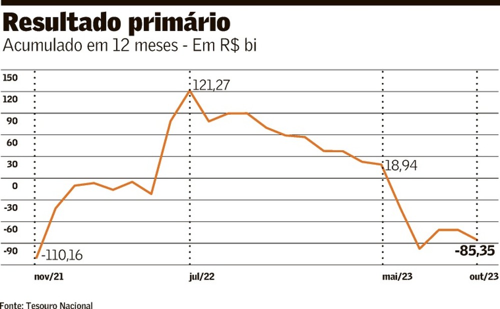 Conforme divulgado ontem pelo Tesouro, o governo central registrou superávit primário de R$ 18,3 bilhões em outubro. Com isso, no acumulado de 12 meses até o mês passado, o governo central teve déficit de R$ 85,3 bilhões, o equivalente a 0,83% do Produto Interno Bruto (PIB). Os dados levam em conta Tesouro Nacional, Previdência Social e Banco Central (BC) e excluem despesas com a dívida pública. A meta de resultado primário para este ano é de déficit de até R$ 213,6 bilhões. Os ministérios da Fazenda e do Planejamento e Orçamento projetam oficialmente resultado negativo de R$ 177,4 bilhões. Mas o secretário do Tesouro Nacional, Rogério Ceron, afirmou na semana passada que o empoçamento de recursos parados nos ministérios pode chegar a R$ 30 bilhões no fim do ano, diminuindo o déficit no mesmo montante.