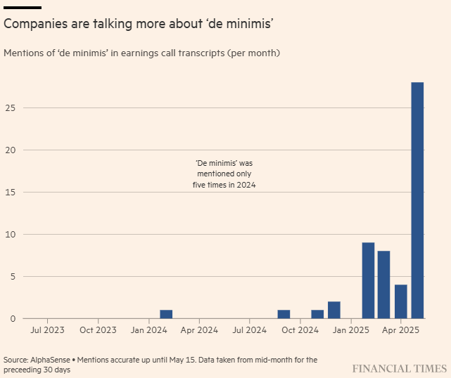 A mudança já afeta o pensamento das empresas. Dados da AlphaSense compilados para o Financial Times mostram que o número de chamadas de analistas mencionando o de minimis saltou de cinco ao longo de 2024 para 28 vezes apenas nos últimos 30 dias.