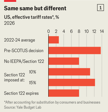 Observando apenas as mudanças nas alíquotas tarifárias dos Estados Unidos, os historiadores do comércio de amanhã podem nem notar a decisão. Em poucas horas, Trump invocou a Seção 122 do Trade Act de 1974 para impor tarifas de 10% sobre todas as importações por 150 dias a partir de 24 de fevereiro. No dia seguinte, disse que elevaria o nível para 15%, o máximo que a lei permite. Antes de a Suprema Corte se pronunciar, a tarifa efetiva dos Estados Unidos era de 13,7%, estima o Yale Budget Lab. Troque as tarifas da IEEPA por tarifas da Seção 122 de 15% e isso recua para 12,2% (veja o gráfico 1). Para comparação, o número era de 2% a 3% antes de Trump tomar posse pela segunda vez, em janeiro de 2025.