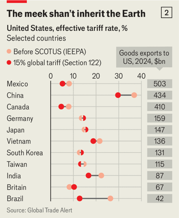 Parceiros comerciais que firmaram acordos com os Estados Unidos, oferecendo concessões para garantir alíquotas tarifárias mais baixas e a graça de Trump, enfrentam dilema semelhante. Como a Seção 122 deve ser aplicada de forma indiscriminada, parceiros comerciais atingidos pela IEEPA, como China e Brasil, acabam se saindo melhor (veja o gráfico 2). Aqueles que negociaram termos melhores, como o Reino Unido e a União Europeia, estão indignados. Alguns provavelmente permanecerão em silêncio. Outros não. “Um acordo é um acordo”, declarou a Comissão Europeia em um comunicado após Trump dizer que elevaria as tarifas de 10% para 15%.