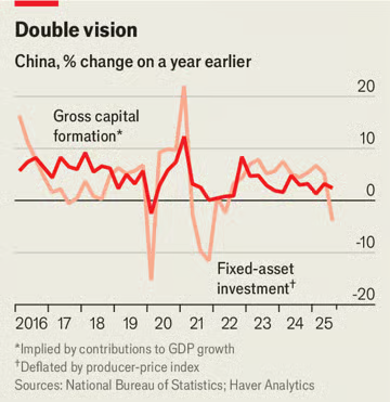 A China divulga, todos os meses, dados sobre o investimento do país em ativos “fixos” (isto é, coisas que não incluem estoques). Informa quanto foi gasto desde o início do ano e como isso se compara com o mesmo período do ano anterior. Nos primeiros nove meses de 2025, a China gastou 37,2 trilhões de yuans (US$ 5,2 trilhões). Isso parece muito. Mas foi 0,5% a menos do que um ano antes. Foi a primeira vez, fora da pandemia de covid-19, que a China registrou um número negativo em dados que remontam a mais de 30 anos.