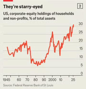 A segunda razão para temer um mercado de baixa é que as famílias americanas têm mais a perder com ele do que em qualquer outro momento anterior. A posse de ações agora responde por mais de 30% dos ativos totais delas, o maior nível desde que o Federal Reserve começou a coletar esses dados em 1945 (veja o gráfico 2). No pico da bolha pontocom, o número equivalente era de 27%.