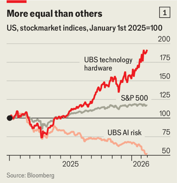 Até agora, as perdas dos investidores de índices foram compensadas pelos ganhos de um grupo de vencedores. Assim como alguns setores foram esmagados, investidores correram para as ações “HALO” (heavy assets, low obsolescence) [ativos pesados, baixa obsolescência]. Empresas de energia e commodities se beneficiaram, assim como utilities resilientes e empresas que vendem bens de consumo básico. Dentro do setor de tecnologia, as empresas que fabricam o hardware que alimenta a IA dispararam (ver gráfico 1). O preço das ações da Sandisk, que projeta e fabrica chips de memória, mais do que dobrou desde o início do ano. Há muito mais reavaliação pela frente, já que os investidores ainda sabem pouco sobre como a IA acabará remodelando as empresas. E não há garantia de que o frágil equilíbrio entre vencedores e perdedores continuará a se sustentar.