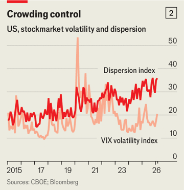 A dispersão do mercado de ações — diferenças esperadas nos movimentos de ações individuais, medida pelo preço de opções — está hoje mais alta do que esteve em 98% do tempo ao longo da última década (ver gráfico 2). Essa medida tende a saltar quando investidores estão rapidamente precificando novas realidades econômicas, o que geralmente envolve o índice principal de ações despencando ou disparando. Exemplos anteriores incluem as quedas acentuadas de março de 2020, quando começaram os lockdowns da covid-19, e o pânico movido por tarifas em abril passado.