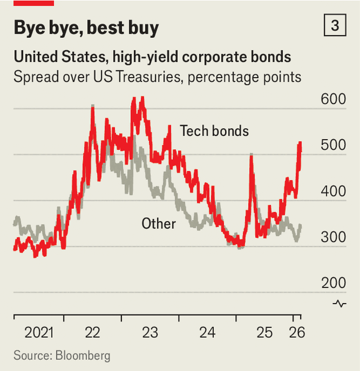 A reavaliação dos investidores também é evidente nos mercados de dívida. No meio do ano passado, títulos “junk” [alto rendimento/baixo rating] arriscados emitidos por empresas de tecnologia americanas rendiam cerca de três pontos percentuais a mais do que títulos do Tesouro (Treasuries). Esse era aproximadamente o mesmo spread dos junk bonds de forma mais ampla, independentemente do setor do emissor. Hoje, os investidores estão exigindo mais compensação de tomadores de tecnologia, de modo que os títulos rendem cinco pontos percentuais a mais do que Treasuries — um spread semelhante ao observado durante o pânico tarifário do ano passado (ver gráfico 3). O restante do mercado mal se mexeu.
