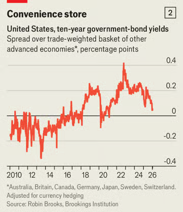 Assim, seria de se esperar que os detentores de títulos do Tesouro americano estivessem entrando em pânico. Mas, se as excentricidades do sr. Trump assustaram os investidores, isso não apareceu. Kent Smetters, da Universidade da Pensilvânia, calcula que os yields [rendimentos] de longo prazo estariam mais de um ponto percentual mais baixos se o problema da dívida americana estivesse sob controle. Ainda assim, os yields dos Treasuries, que se movem de forma inversa aos preços, estão mais baixos do que estavam há um ano — e caíram mais nesse período do que os yields dos títulos públicos de dez anos em qualquer outra grande economia rica do G7 (ver gráfico 1). Em outras palavras, salvo por um solavanco em abril, quando o sr. Trump lançou sua guerra comercial não provocada, os bond vigilantes pouparam a América.