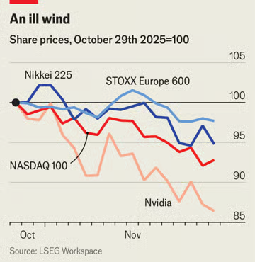 Nos mercados em geral, o humor dos acionistas mudou de otimismo (“bullishness”) para fatalismo. As ações vêm subindo há anos, impulsionadas pela esperança de que a inteligência artificial turbinará os lucros — esperanças que a maioria dos investidores profissionais hoje considera excessivamente otimistas. Em termos gerais, a recente onda de vendas é perfeitamente suportável. Embora o índice S&P 500, das grandes empresas americanas, esteja 4% abaixo do seu pico de outubro, também acumula alta de 84% desde o fundo de 2022. Mas o fato de as ações caírem quando as notícias são boas é um sinal preocupante de que um longo mercado de alta (“bull market”) pode finalmente estar perdendo força. Os traders estão em alerta e, na próxima semana, ficarão atentos a sinais de que o movimento de venda possa acelerar.