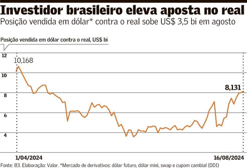 É nesse contexto que a aposta favorável ao real feita pelo investidor institucional local voltou a aumentar. Desde o começo do mês, com a divulgação da ata da reunião de julho do Comitê de Política Monetária (Copom) do BC, a posição vendida em dólar contra o real (aposta na queda da moeda americana) pelo investidor local aumentou de US$ 4,6 bilhões para US$ 8,13 bilhões na última sexta-feira, de acordo com dados da B3 sobre derivativos de câmbio (dólar futuro, cupom cambial, swap cambial e dólar mini).
