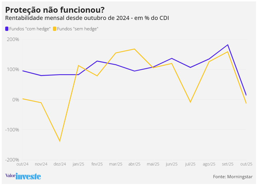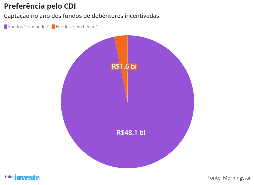 As debêntures incentivadas são de longuíssimo prazo e remuneram uma taxa mais a inflação, o que eventualmente gera oscilação nos preços desses papéis e nas cotas dos fundos. Porém, o objetivo da maioria dos fundos é bater o CDI e não a inflação. Os produtos trocam o indexador fazendo uma operação no mercado futuro. São os chamados fundos “hedgeados”, que, na teoria, oscilam menos. Mas o mês de outubro mostrou que esses fundos oscilam também.