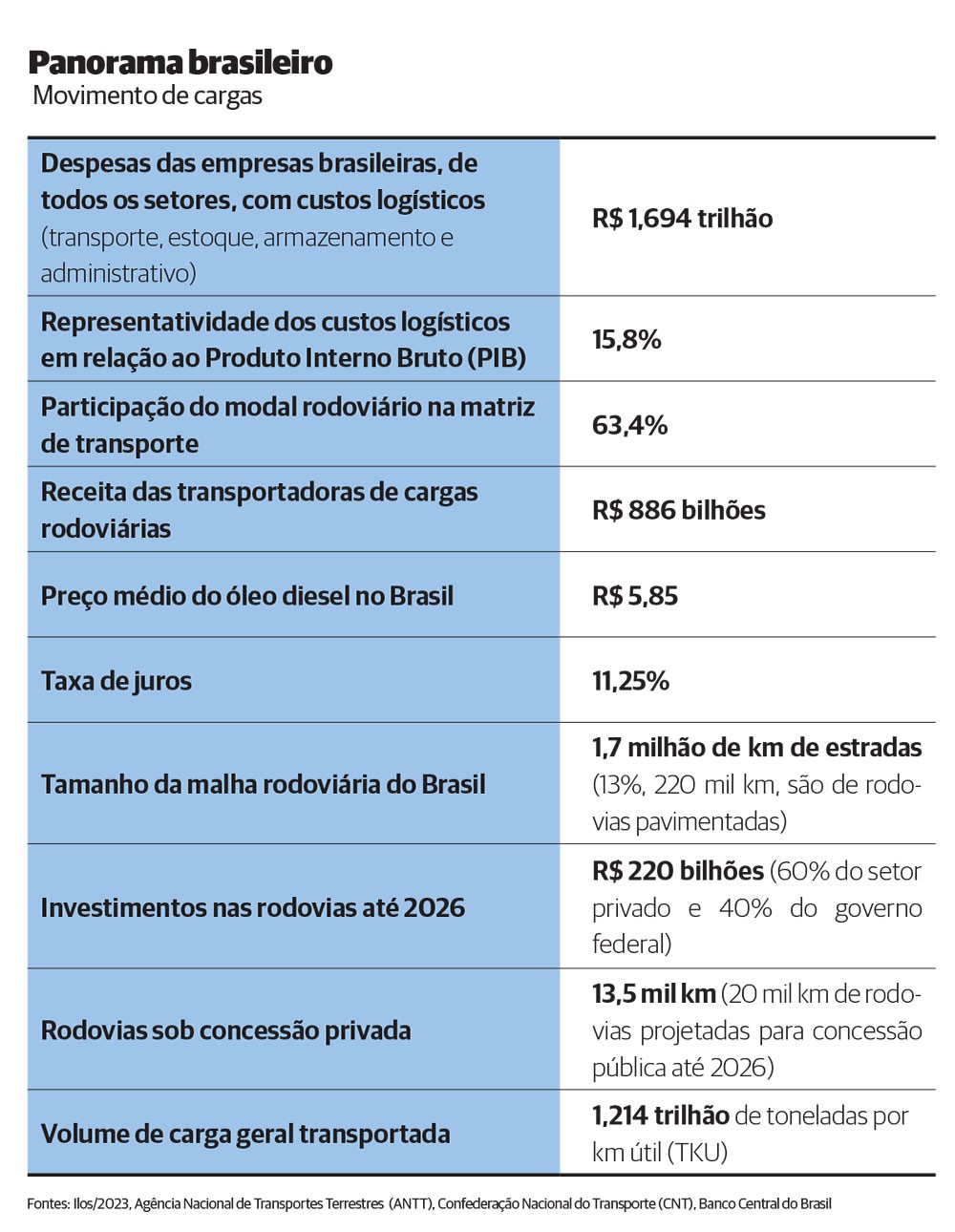 A queda dos custos logísticos das empresas brasileiras, basicamente por efeito da redução da taxa de juros e de preços mais razoáveis dos combustíveis, alimenta a expectativa de bons negócios das transportadoras de cargas em 2024, mas ainda não supera os níveis de incertezas. No ano passado, os custos logísticos, entre os quais estão os gastos com o transporte de cargas por meio de caminhões nas rodovias brasileiras, caíram para 15,3% em relação ao Produto Interno Bruto (PIB) do Brasil (por volta de R$ 10 trilhões), depois de atingirem o recorde histórico de 16,1% do PIB em 2022. “Foi uma melhora significativa sem dúvida, mas ainda insuficiente para mudar o cenário atual, devido aos baixos investimentos, públicos e privados, programados para o setor de transporte no país”, diz Mauricio Lima, sócio-diretor do Instituto de Logística e Supply Chain (Ilos).