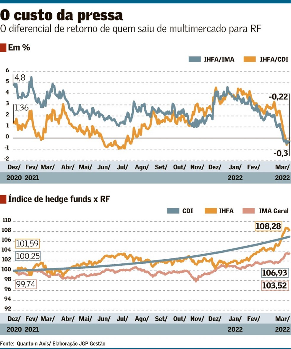 É o que mostra um exercício feito pela gestora de recursos carioca JGP. Intrigado com a movimentação dos investidores conforme as taxas de juros foram subindo, Ilan Parnes, sócio integrante da área de relações com investidores da casa, considerou cada data como a potencial para a transferência de recursos. Tomou como base o índice de hedge funds (IHFA), referência para o segmento de fundos mistos, e o IMA-Geral, que representa uma cesta de títulos do Tesouro Nacional semelhante à composição da dívida pública interna, ambos calculados pela Anbima.