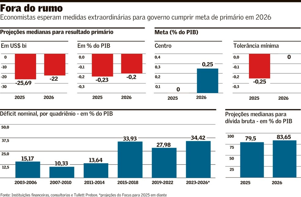 A projeção de déficit de 0,2% do PIB em 2026 não significa, necessariamente, que os economistas acreditam que o governo vá descumprir a banda da meta, mas indica que, com as informações disponíveis hoje, na avaliação dos analistas, o governo ainda não consegue fechar as contas e vai precisar buscar saída, provavelmente, em mais receitas, já que corte de despesas não tem sido a estratégia preferencial, dizem. Alguns economistas, no entanto, acham que o governo pode até mesmo mudar a meta do ano.