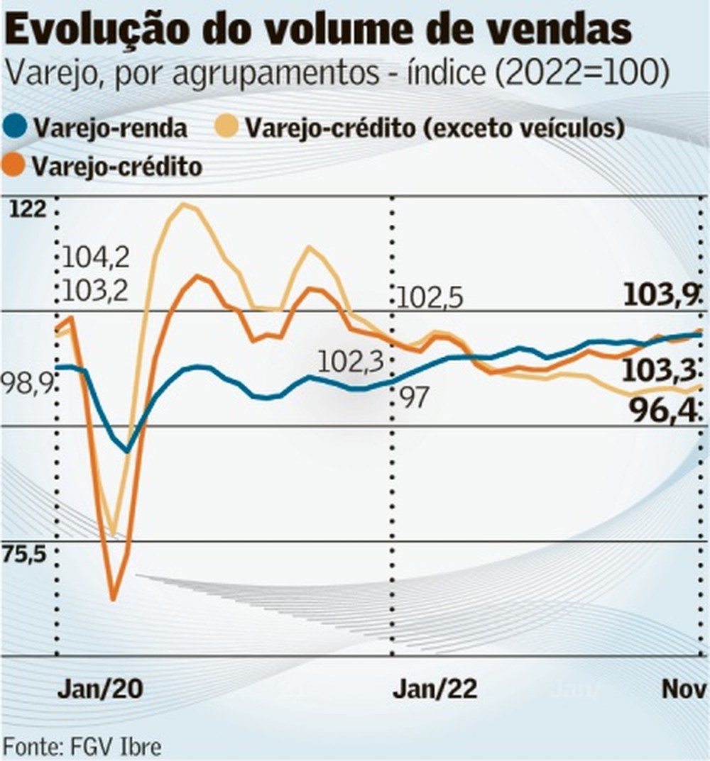 Após desaceleração verificada desde 2022, o varejo de bens duráveis, mais dependente do crédito, esboçou reação no fim do ano passado e dá sinais de que pode ter resultados melhores em 2024. Dados do Instituto Brasileiro de Economia (FGV Ibre) mostram que, em novembro, o chamado varejo-crédito, que inclui móveis, eletrodomésticos e veículos, subiu 3,3% em comparação a outubro. O varejo-renda, mais dependente do rendimento das famílias e que inclui alimentos, medicamentos e combustíveis, avançou 0,4% em igual período.