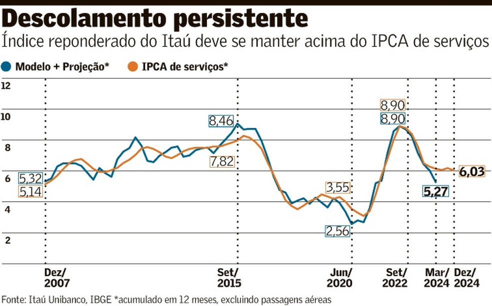Olhando adiante, o Itaú espera que o mercado de trabalho continue pressionando os preços. Rodando um modelo com base no índice reponderado e as projeções de inércia da inflação e taxa de desemprego é possível ver que o indicador se mantém acima do IPCA de serviços nos próximos trimestres – ele chega ao fim do ano apontando alta de 6,03% em 12 meses.