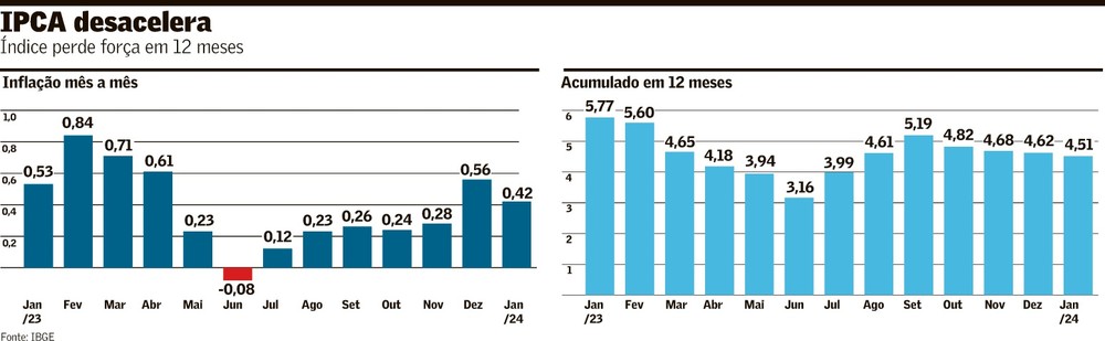 O indicador abriu o ano de 2024 com alta de 0,42%, de acordo com o Instituto Brasileiro de Geografia e Estatística (IBGE). A taxa ficou acima da mediana captada pelo Valor Data, que previa alta de 0,36%. Em janeiro de 2023, a taxa foi de 0,53%.