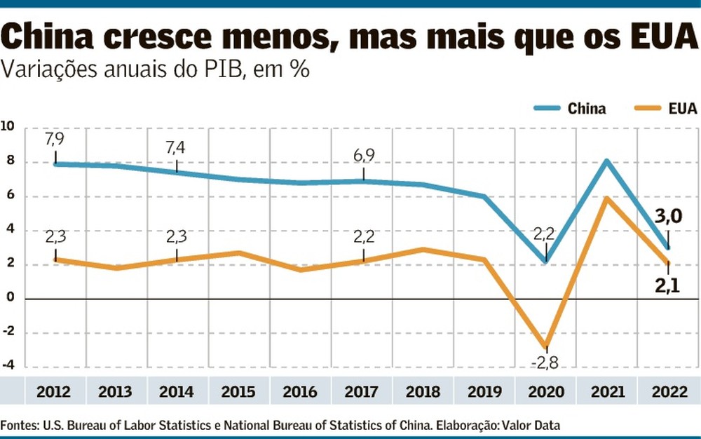 Ao longo de 2022, diante do impacto na atividade dos recorrentes lockdowns da política de covi-zero de Pequim, economistas privados foram gradativamente rebaixando suas previsões para o PIB chinês, com alguns passando ver a possibilidade do crescimento da economia dos EUA superar o do gigante asiático – algo que não ocorre desde 1976. Em maio, a Bloomberg Economics chegou a prever que a economia da China cresceria apenas 2%, enquanto a previsão para o PIB americano era de uma expansão de 2,8%.