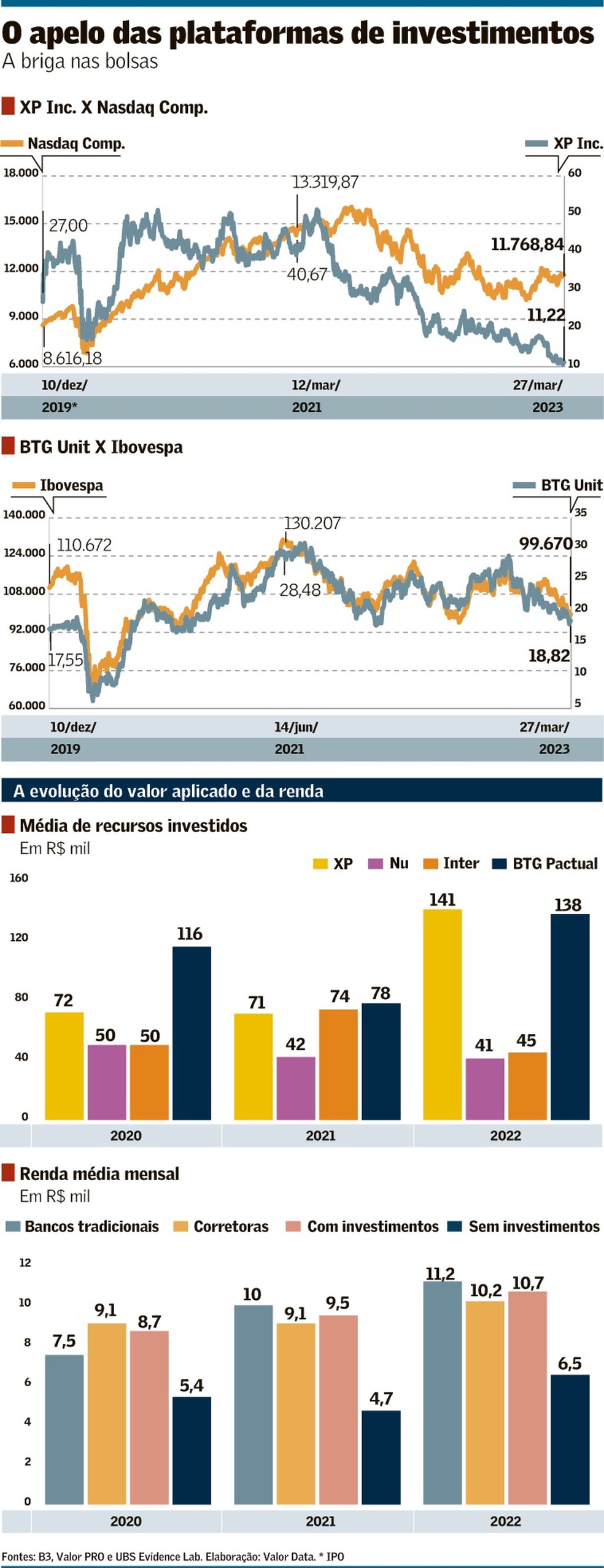 Pelo mapeamento do UBS BB, a média de recursos investidos tanto na XP quanto no BTG era parecida, com R$ 141 mil e R$ 138 mil, respectivamente. A renda média mensal de quem tinha recursos aplicados nas corretoras era de R$ 10,2 mil, em comparação aos R$ 11,2 mil nos bancos tradicionais.